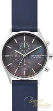 SKAGEN Holst SKW6653 to czasomierz, w którym modne kształty spotykają się z klasyczną kolorystyką. Stalowa koperta typu slim (zaledwie 7 mm grubości) z pewnością zmieści się pod każdym mankietem koszuli. Jej średnica wynosi 42 mm. Zawieszono ją na skórzanym pasku, który dodaje modelowi klasycznego charakteru. Niebieska, perłowa tarcza w minimalistycznym stylu jest przejrzysta i czytelna dzięki wyraźnym indeksom. Zegarek posiada dokładny mechanizm kwarcowy zasilany baterią oraz rozbudowany chronograf mierzący czas do 1/10 sekundy. Wodoszczelność klasy 30M pozwala na nieznaczny kontakt z wodą.