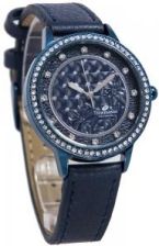Designerski damski zegarek na pasku. Dookoła koperty zdobienie z połyskujących kamieni. Granatowa tarcza, indeksy wykonane z cyrkoni, w środku tarczy częściowo zdobienie w postaci wytłoczenia o motywie kwiatowym a częściowo w postaci „pikowania” ozdobionego maleńkimi cyrkoniami. Całość tworzy niepowtarzalny wygląd. Zegarek idealny dla Pań, które uwielbiają świecidełka.
